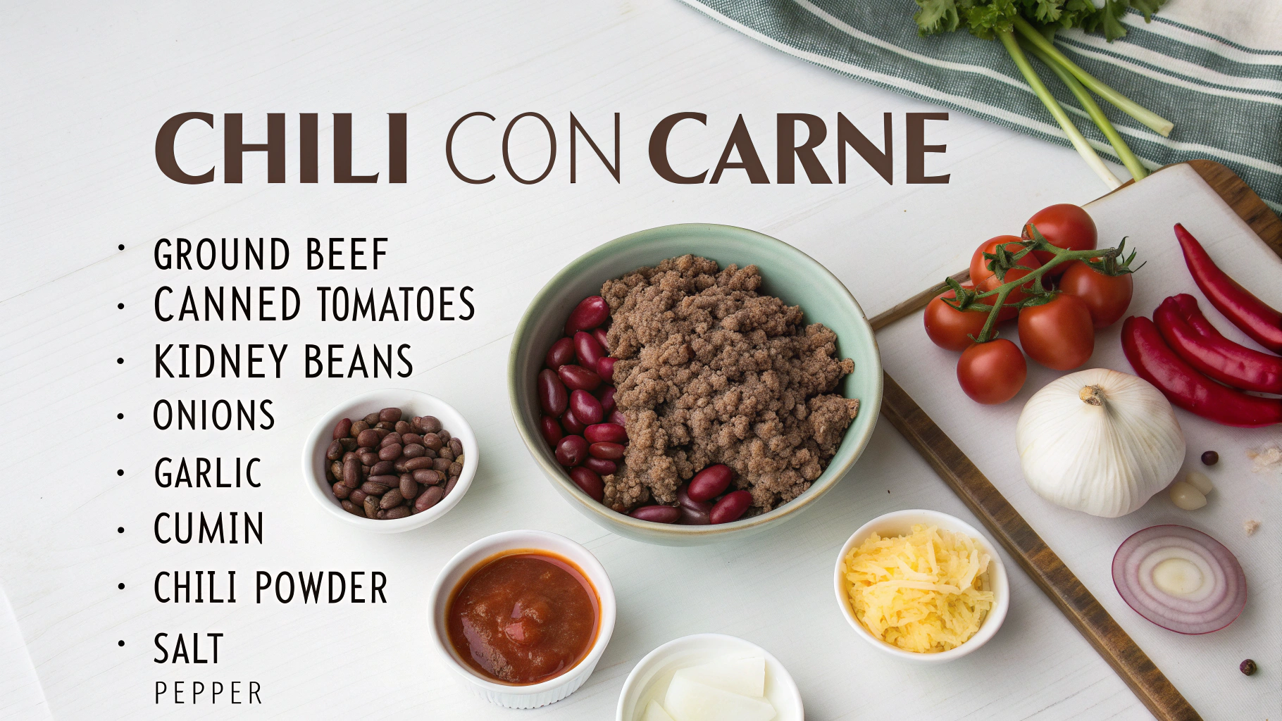 Ces ingrédients forment la base d'un plat épicé convivial authentique, avec un équilibre parfait entre saveurs profondes et notes épicées qui caractérisent le véritable chili con carne.