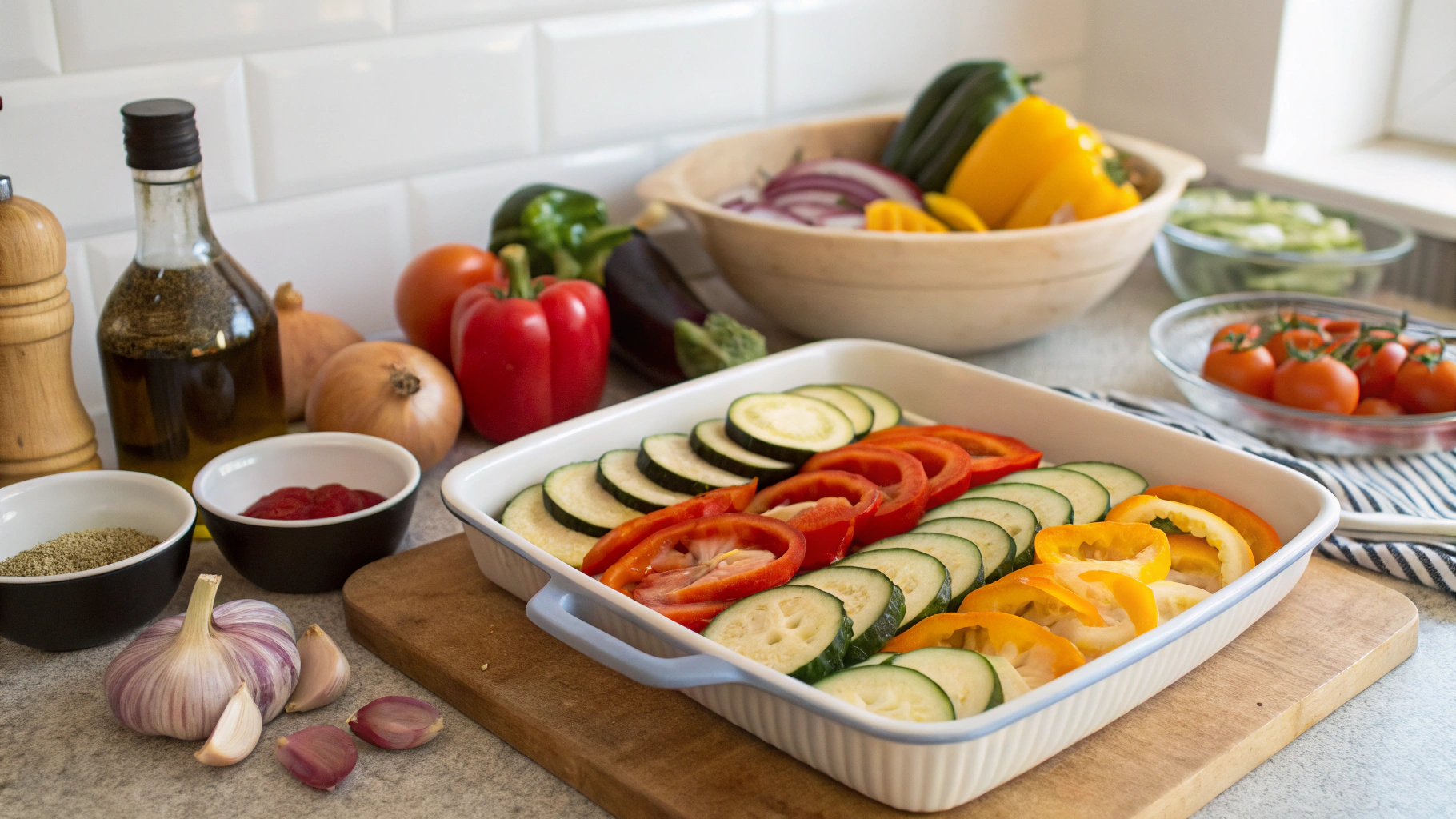 Préchauffez votre four à 180°C (thermostat 6). Lavez soigneusement tous vos légumes sous l'eau froide. Coupez les extrémités des courgettes et des aubergines, puis tranchez-les en rondelles d'environ 5mm d'épaisseur – ni trop fines (elles se désintégreraient) ni trop épaisses (elles resteraient crues). Pour les tomates, optez pour des tranches légèrement plus épaisses (7mm) car elles réduisent davantage à la cuisson. Émincez finement les oignons et hachez l'ail.