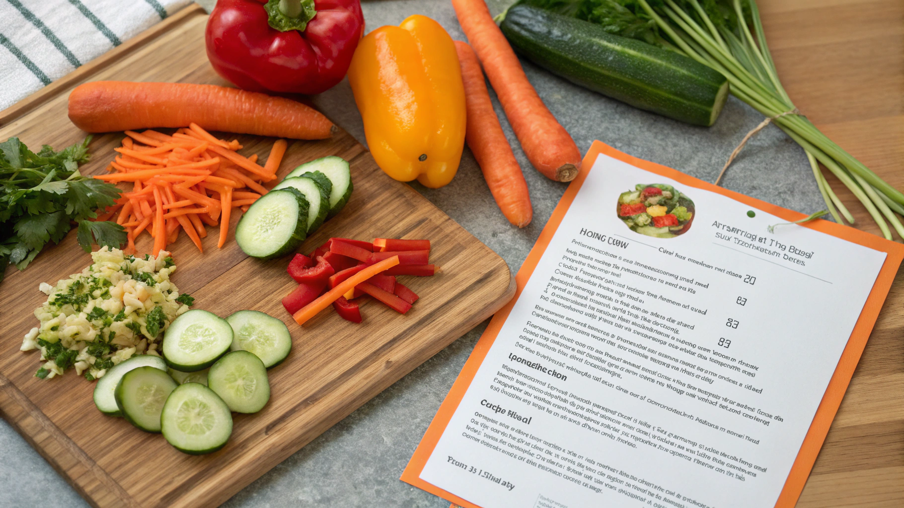 Coupez le concombre en demi-lunes fines (environ 3mm d'épaisseur). Pour les carottes, utilisez une mandoline réglée sur 2mm ou râpez-les grossièrement pour préserver leur croquant. Tranchez les poivrons en fines lanières, le chou en chiffonnade et l'oignon en rondelles très fines. Cette technique de coupe variée crée des textures différentes qui rendront votre salade de légumes croquants plus intéressante en bouche.